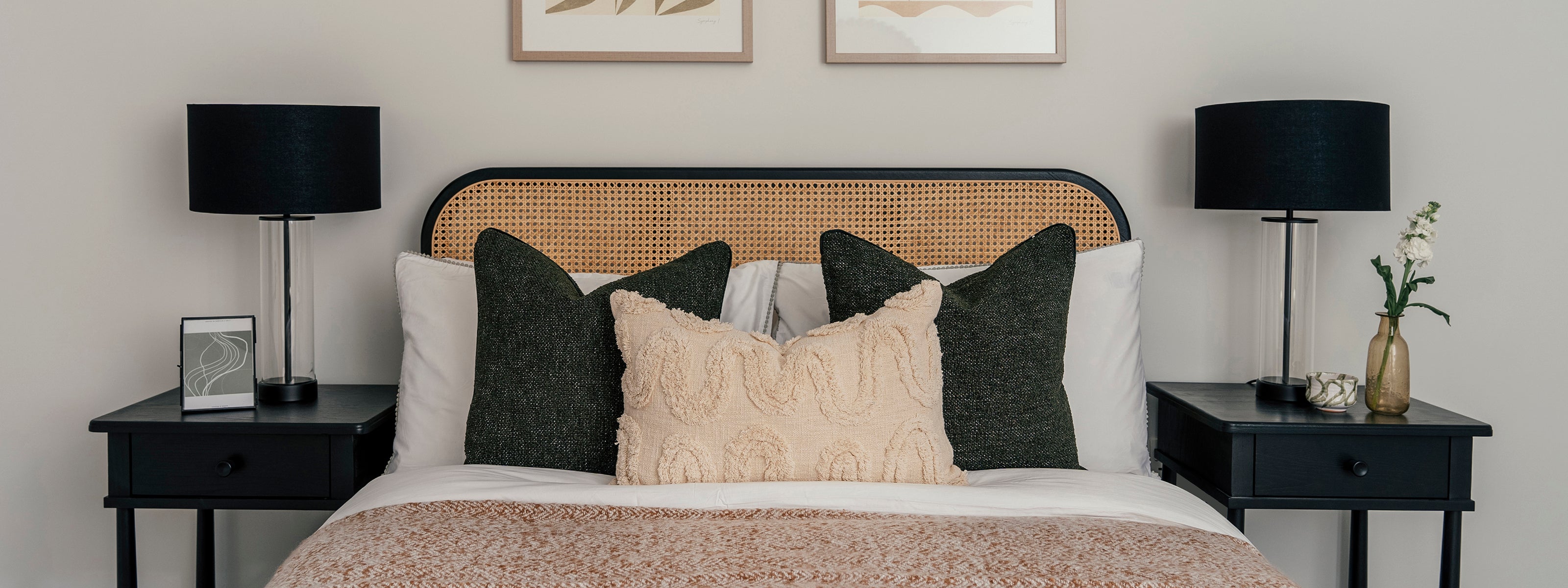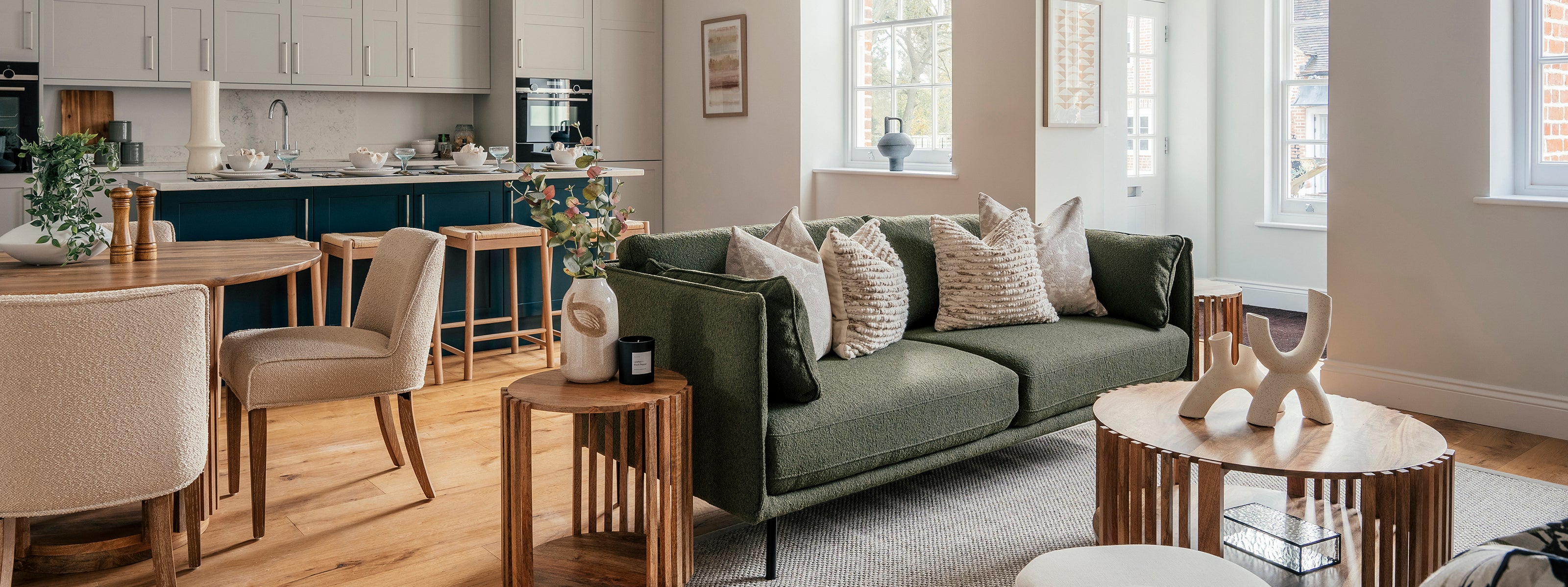 We have designed five staging schemes on behalf of our client for this historical site, to showcase how potential buyers could use each space and visualize themselves at home - whether that be in one of the 2 or 3-bedroom mews style houses, or one of the spacious 2-bedroom apartments in the Manor House. Brizes Park has pituresque surroundings on the estate which we wanted to incorpate within the design schemes, using organic shades of green and rich wood finishes to bring an element of the outside-in. Small touches of antique brass in the lighting and decorative accessories give a subtle luxurious finish, whilst using textured ceramics and plenty of foliage has created a natural and calming ambience, complimenting this tanquil estate beautifully.