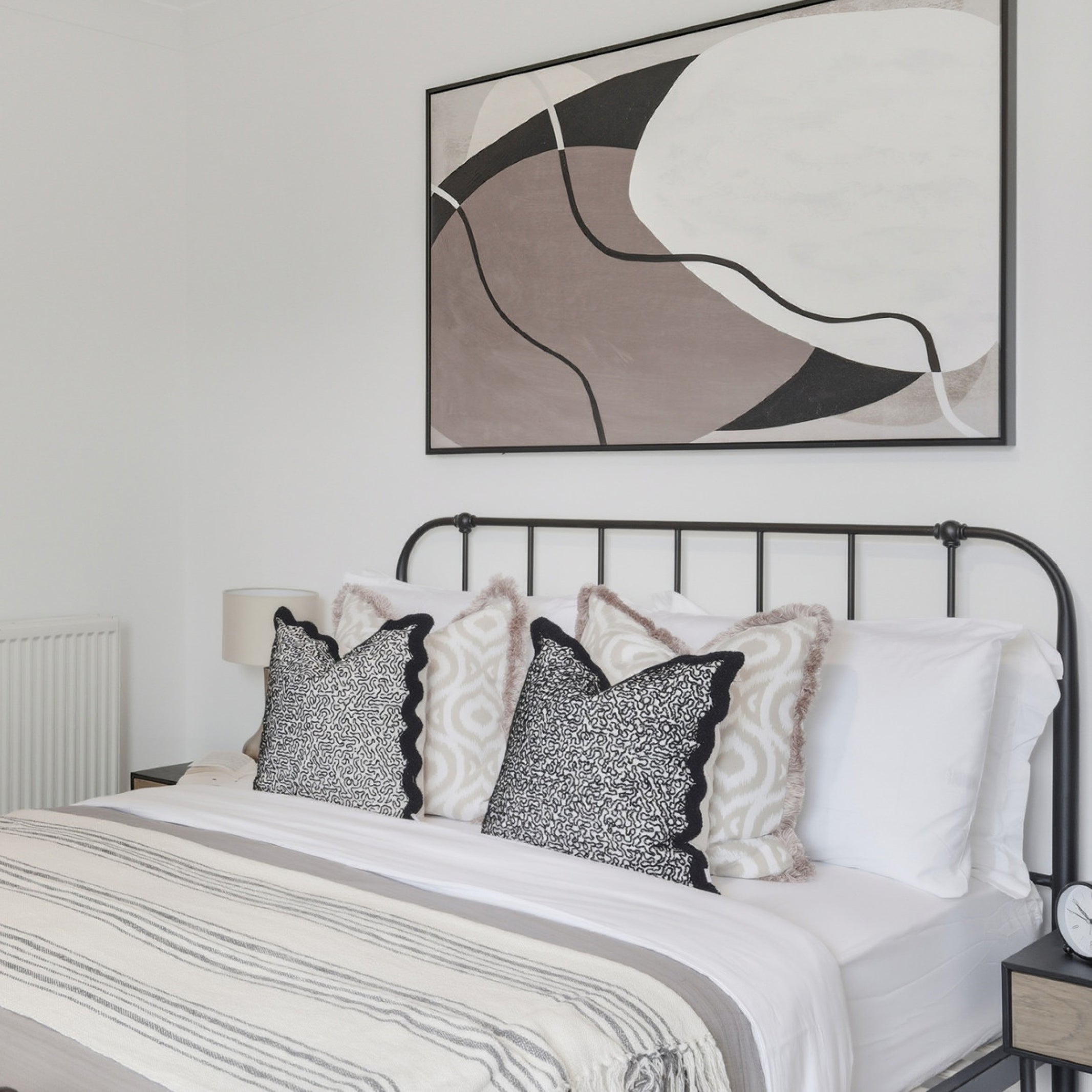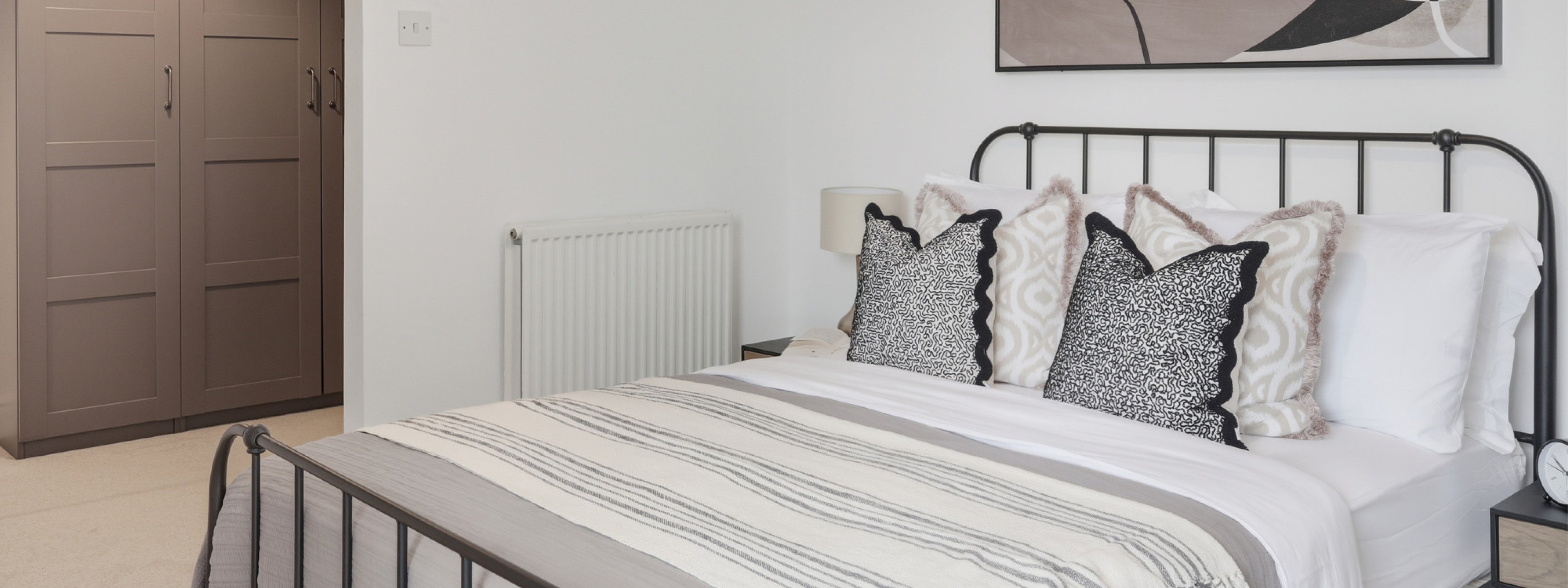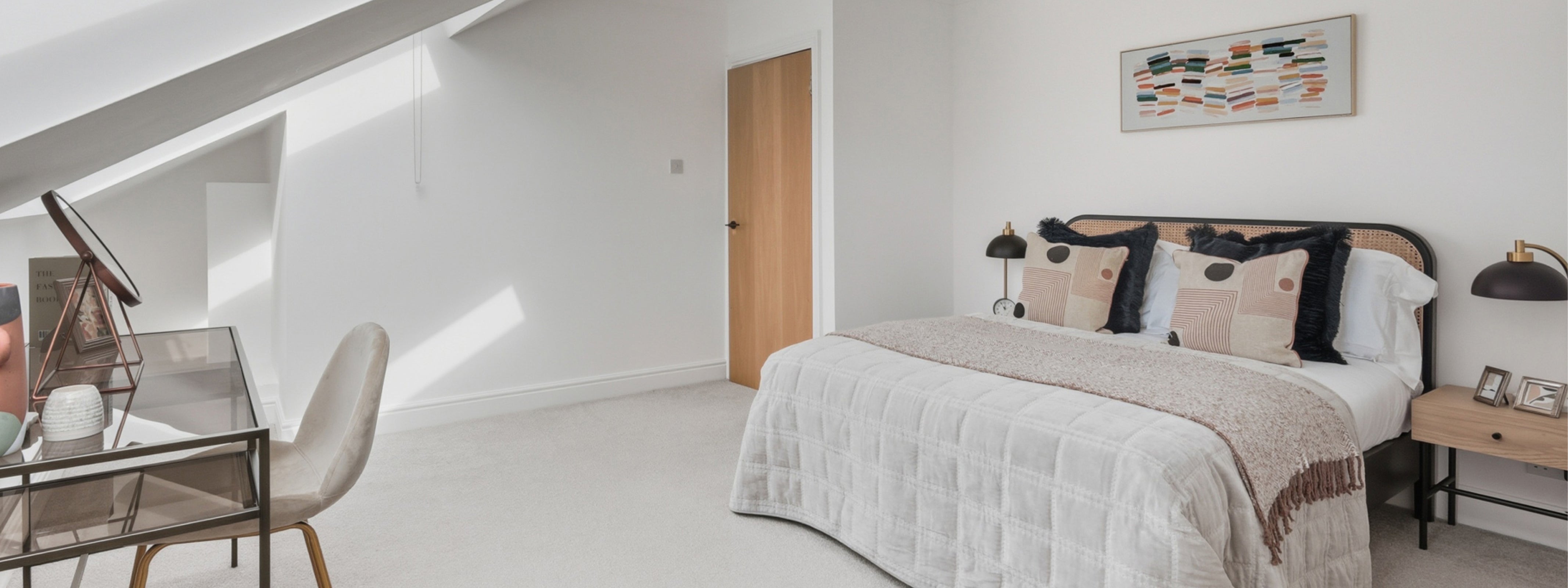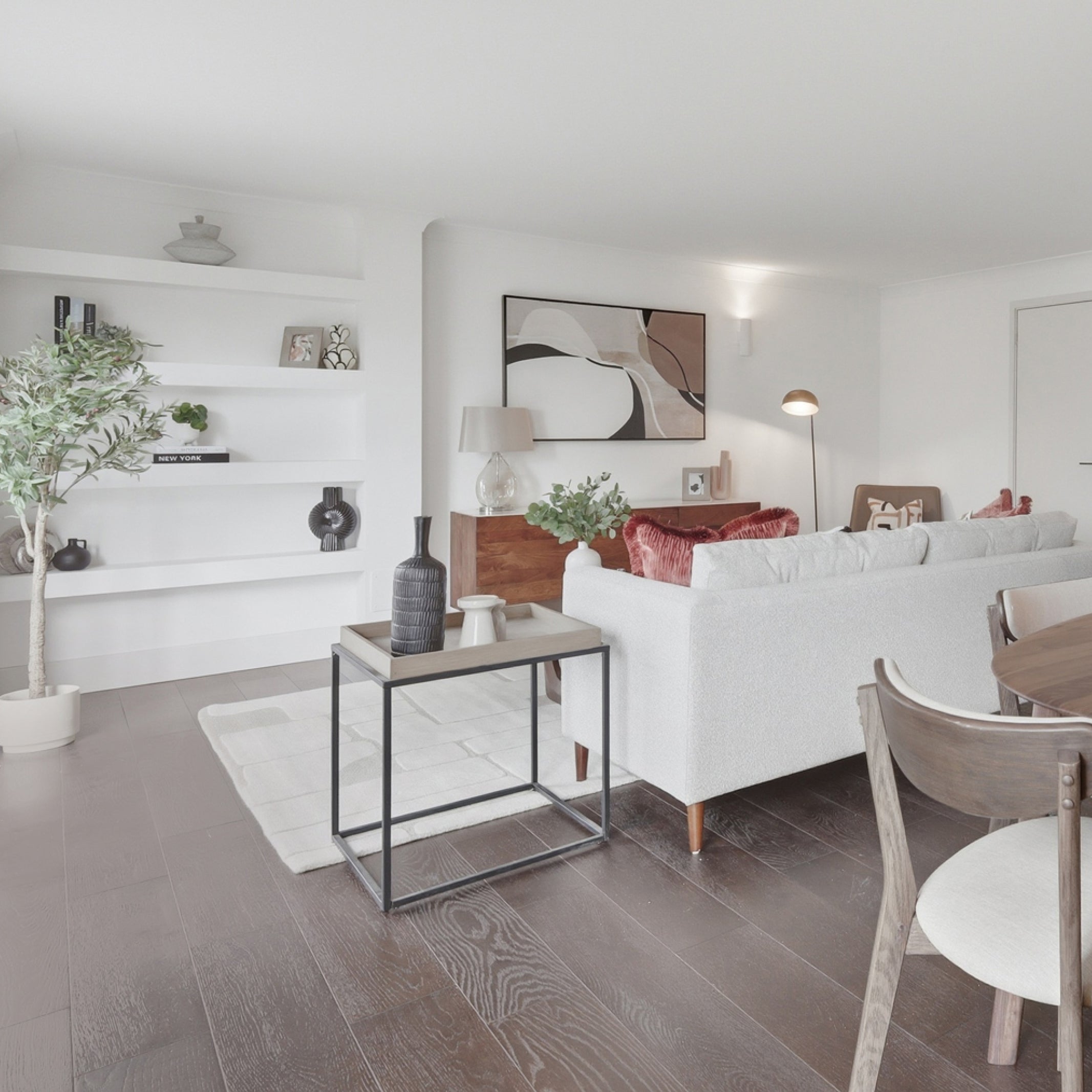 The design of this 2-bedroom apartment in Isle of Dogs, East London, features industrial finishes and a natural colour pallet inspired by the beautiful exposed brick wall in the living area. We teamed smoked oak and sleek black metal furniture with textured upholstery in rust and cream tones, creating the perfect combination of modern and comfort.