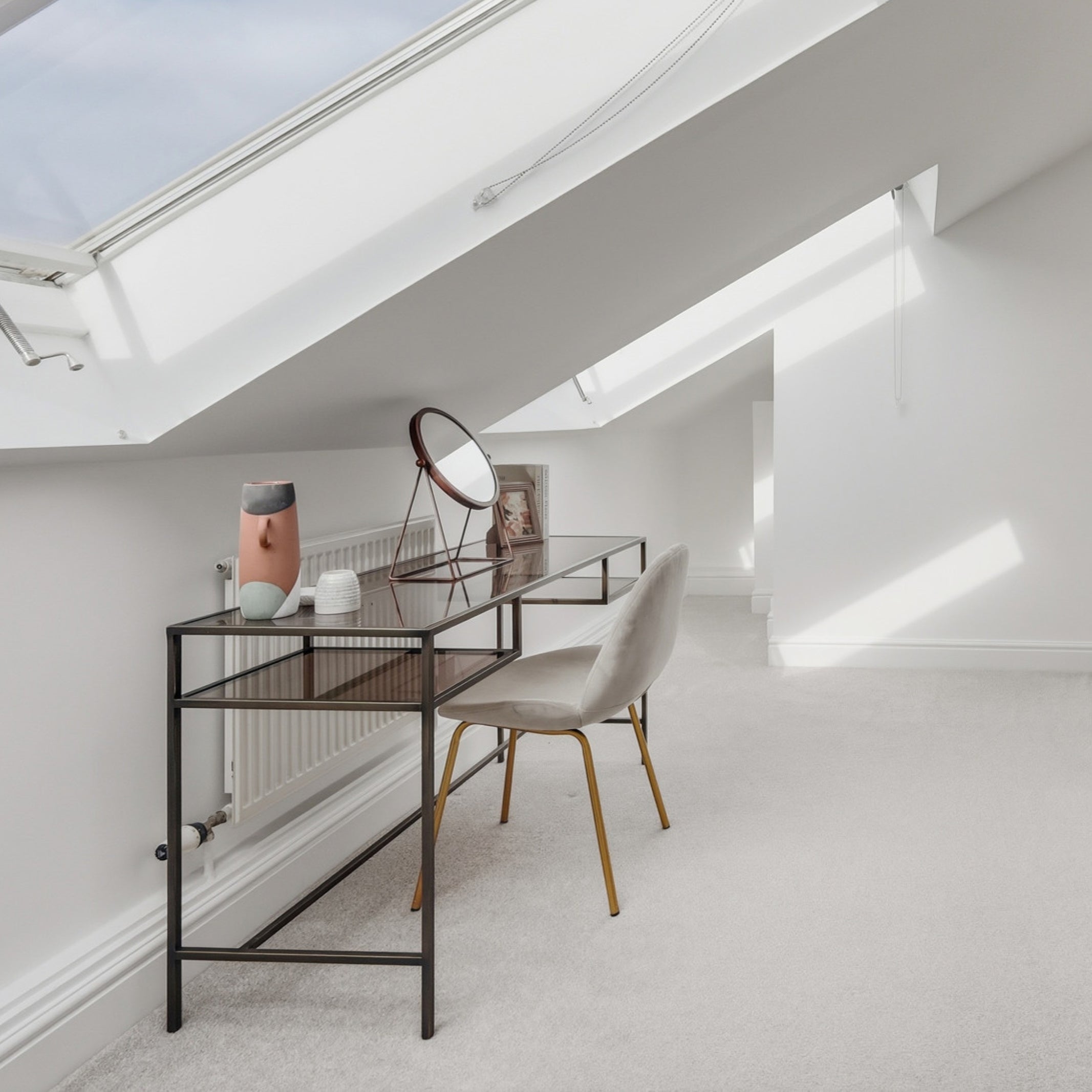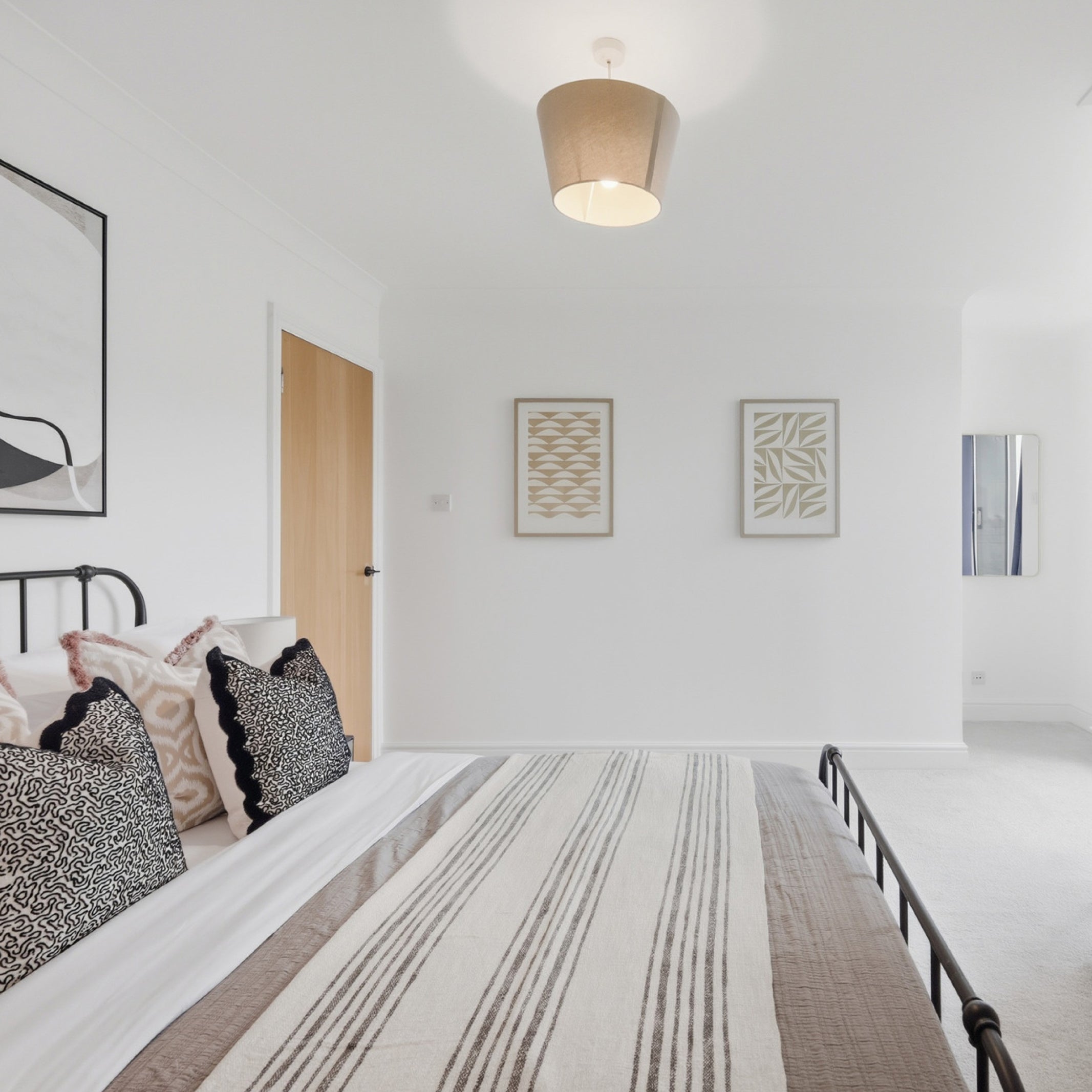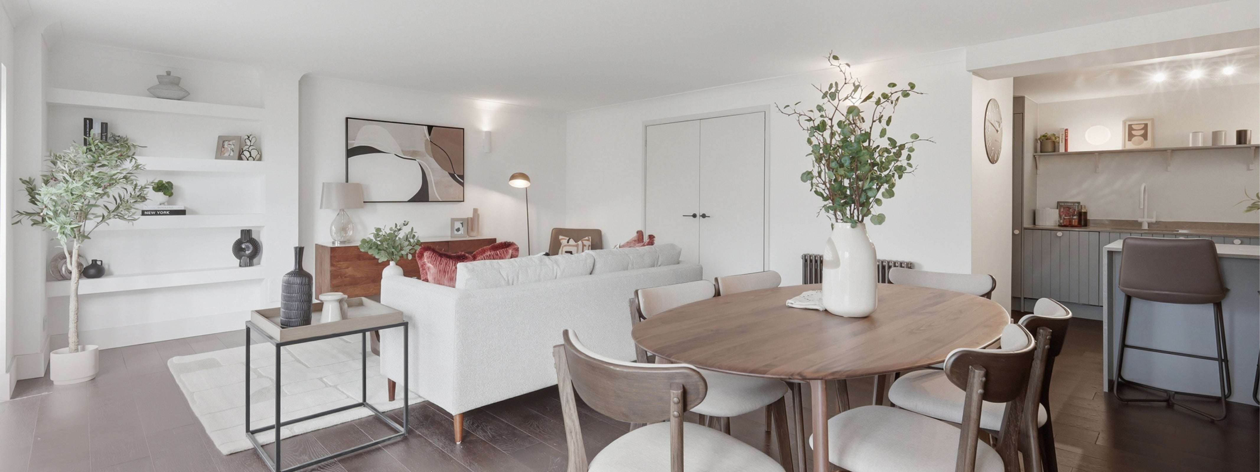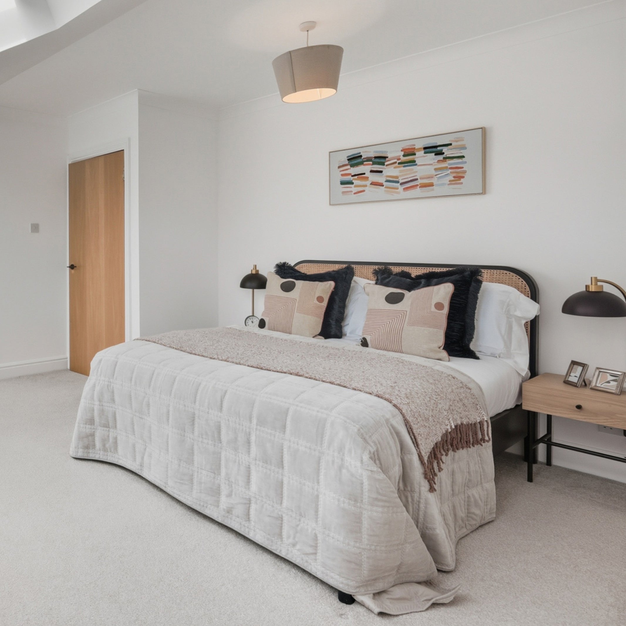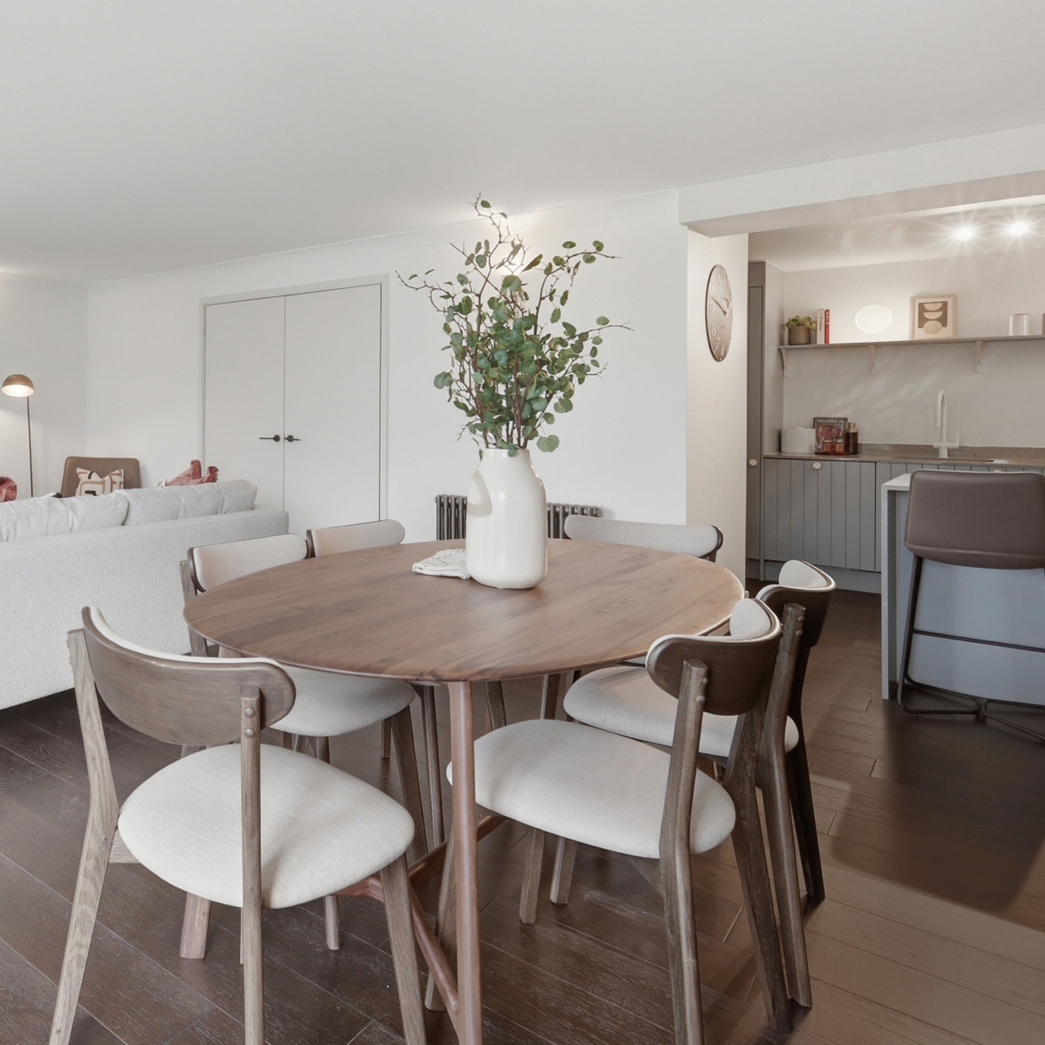 The design of this 2-bedroom apartment in Isle of Dogs, East London, features industrial finishes and a natural colour pallet inspired by the beautiful exposed brick wall in the living area. We teamed smoked oak and sleek black metal furniture with textured upholstery in rust and cream tones, creating the perfect combination of modern and comfort.