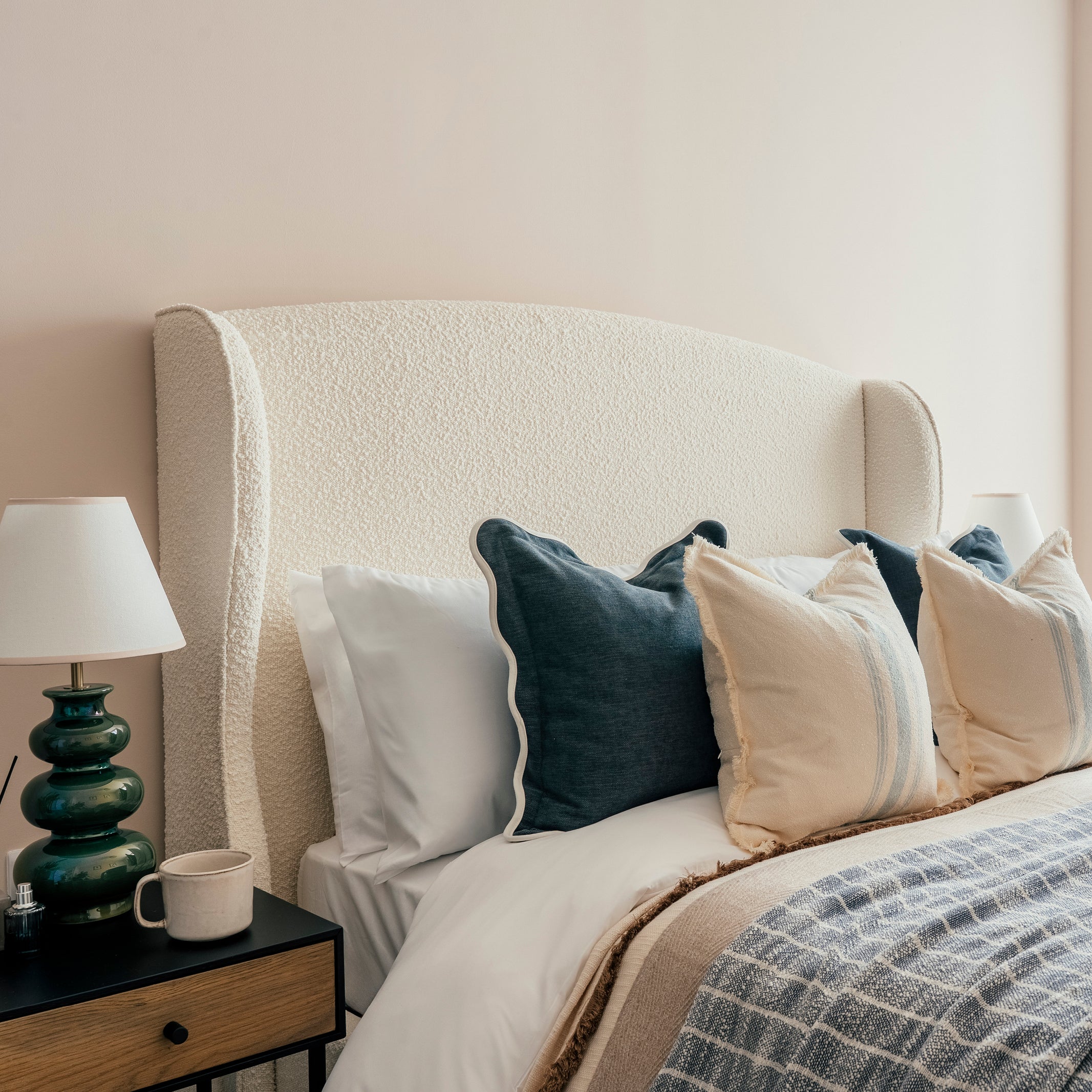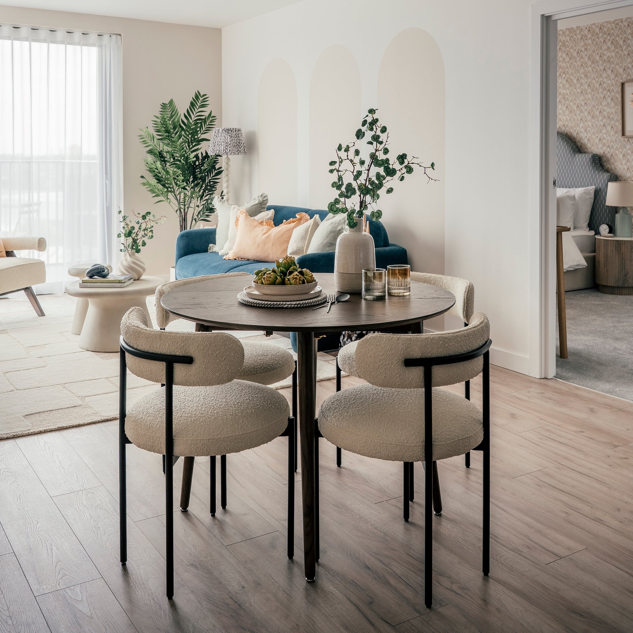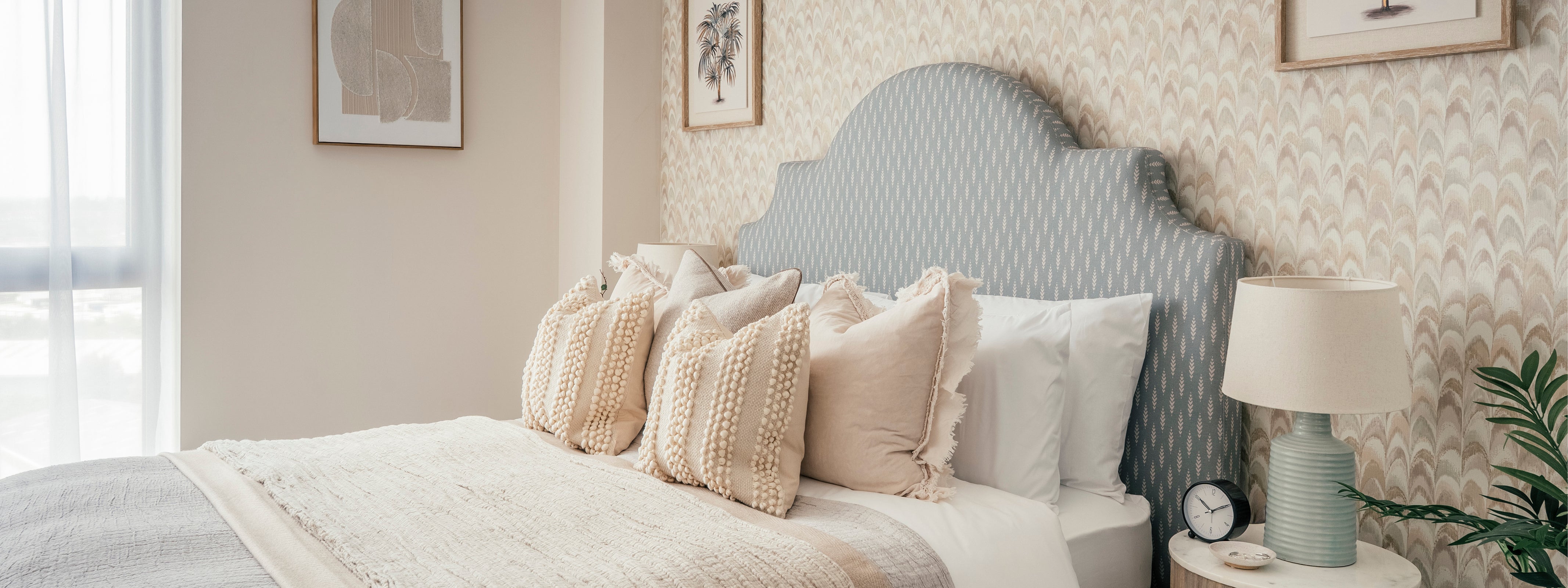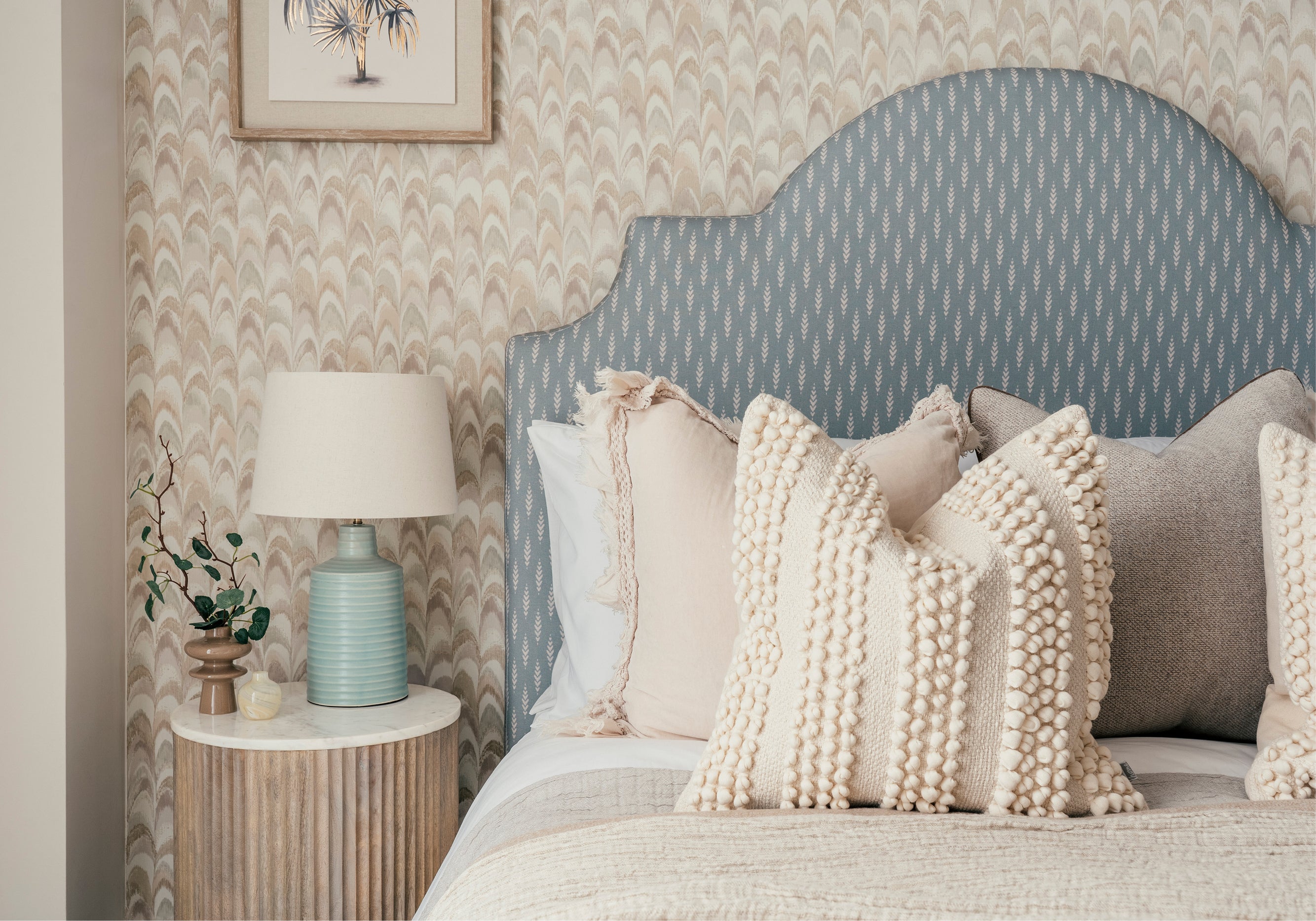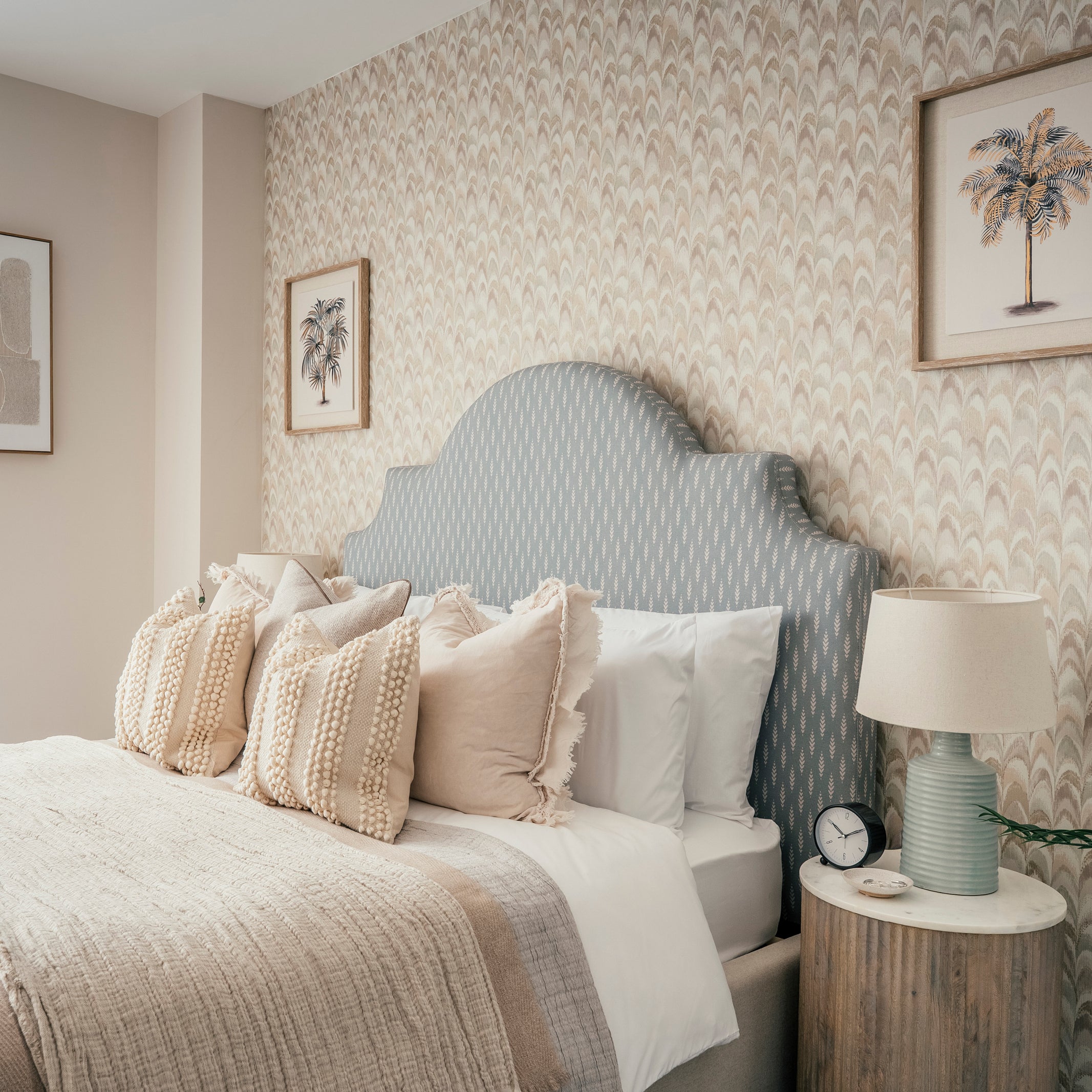 Using a variety of botanical touches through the assortment of plants and aquamarine colour pallet, we wanted to bring the essence of the outdoors into the space, reflecting the location of The Lock showhome being alongside Greenford Quay. The design features curved silhouettes in the furniture choices with round edges on table tops, and more subtly in the wallpaper and artwork. These details soften the square rooms, creating an open and relaxed atmosphere - perfect to embody the syle of living at Greenford Quay development.