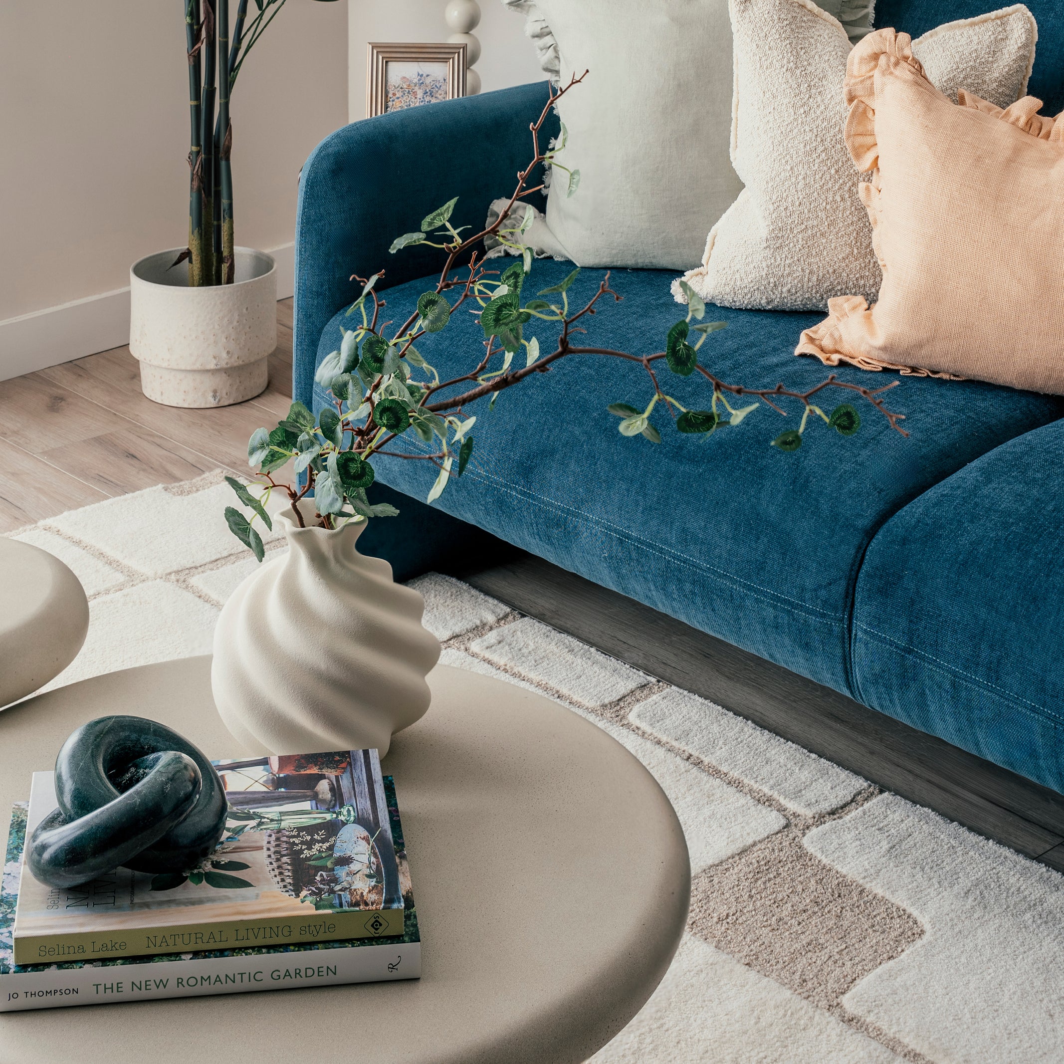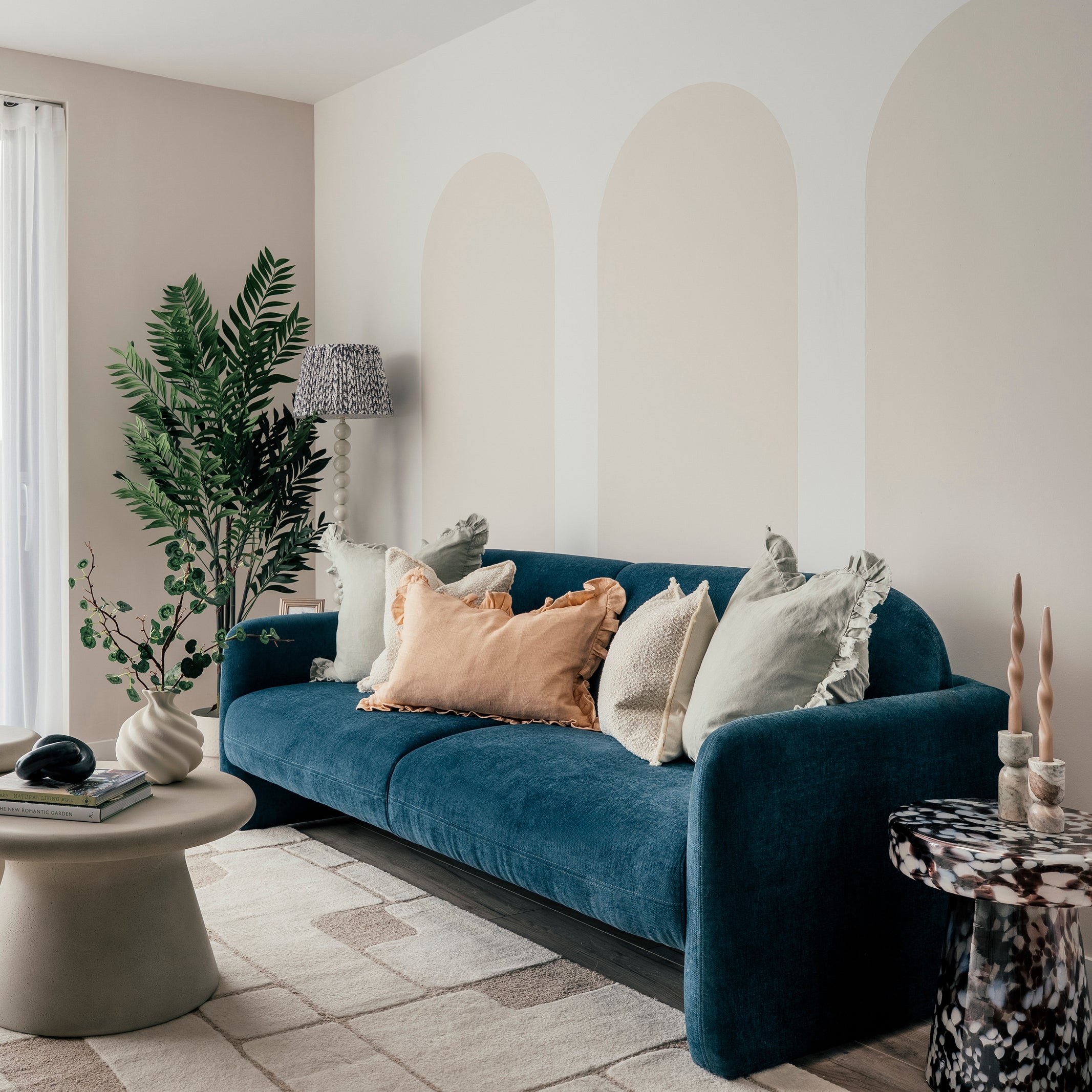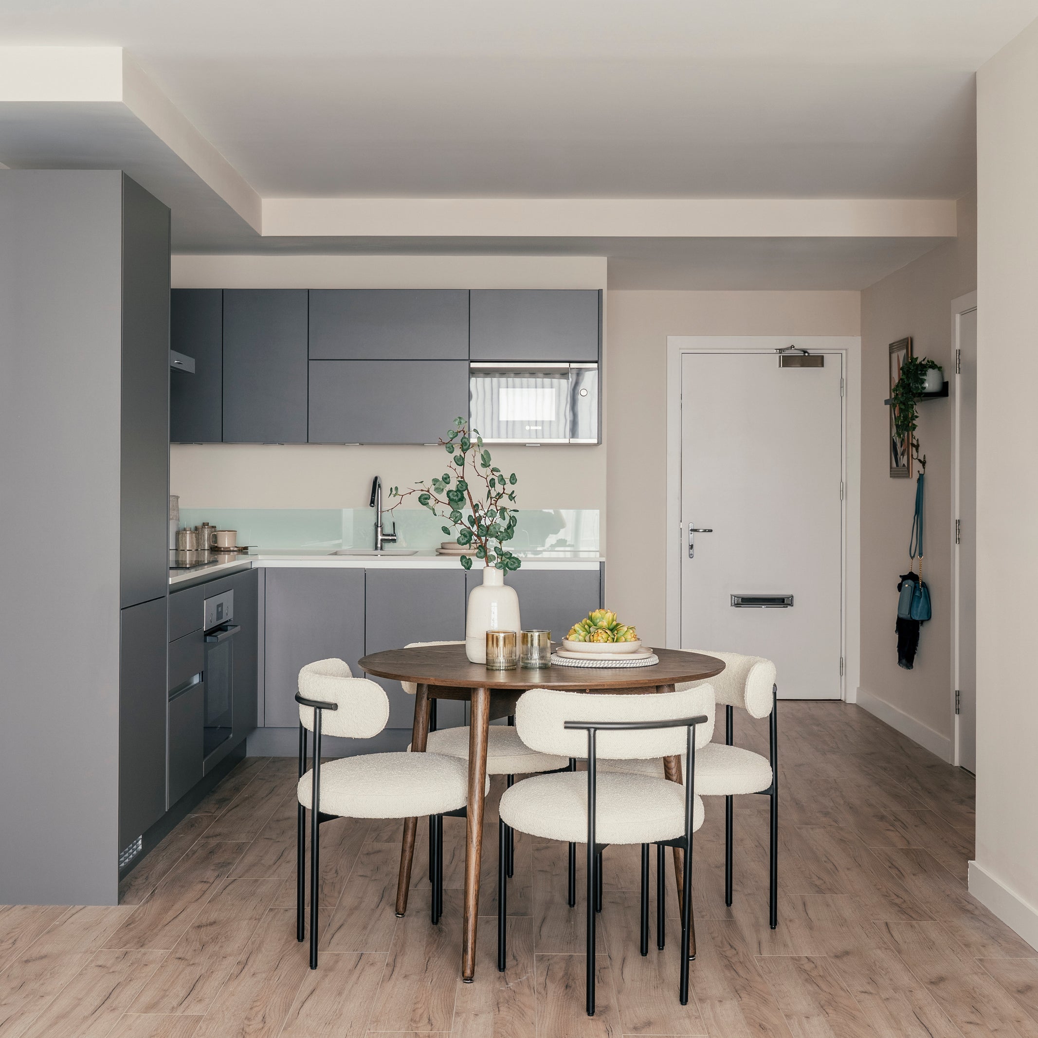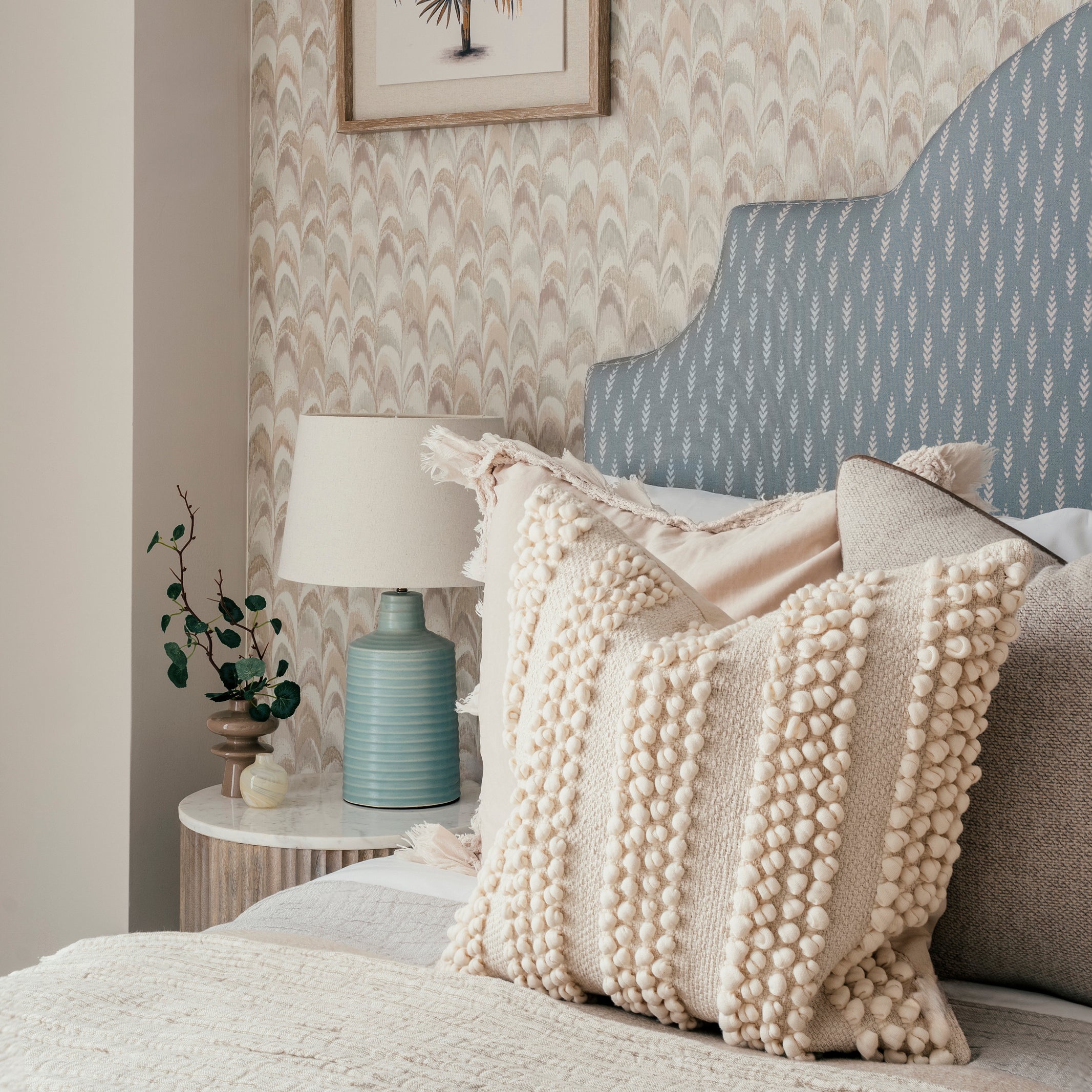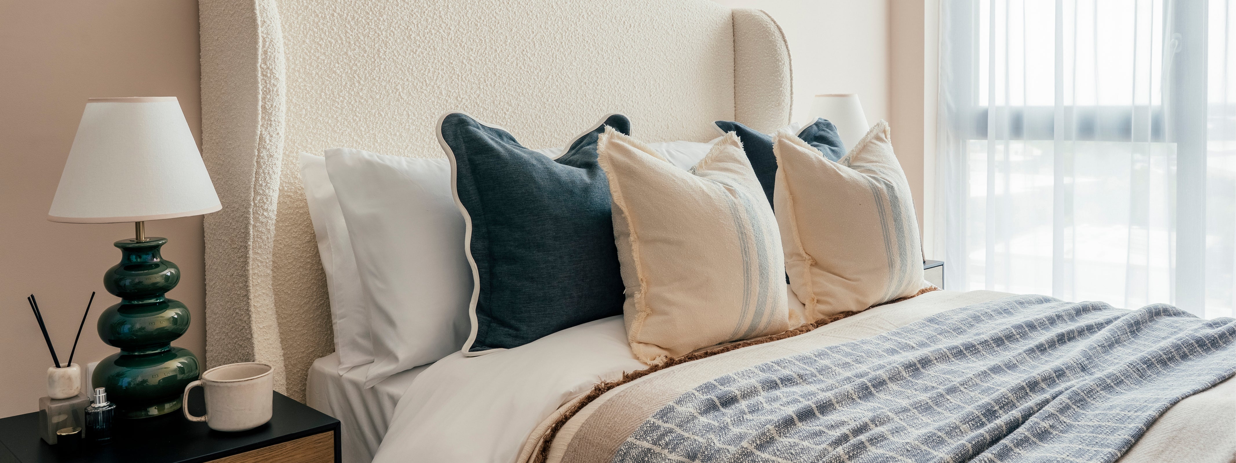 Using a variety of botanical touches through the assortment of plants and aquamarine colour pallet, we wanted to bring the essence of the outdoors into the space, reflecting the location of The Lock showhome being alongside Greenford Quay. The design features curved silhouettes in the furniture choices with round edges on table tops, and more subtly in the wallpaper and artwork. These details soften the square rooms, creating an open and relaxed atmosphere - perfect to embody the syle of living at Greenford Quay development.