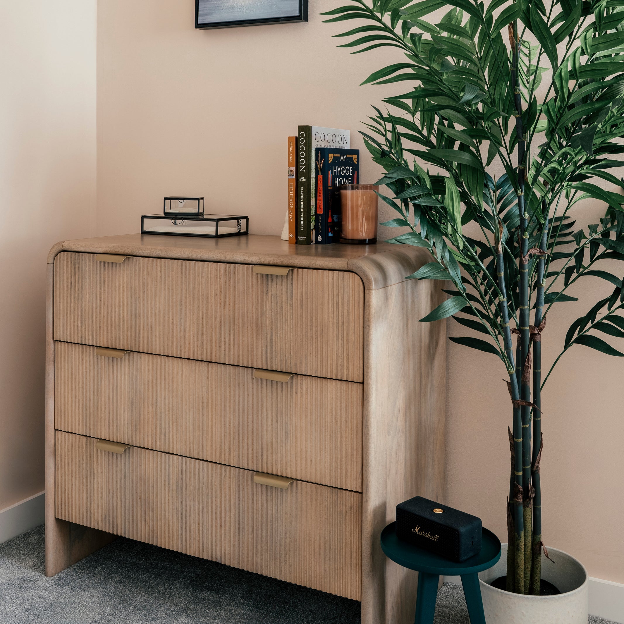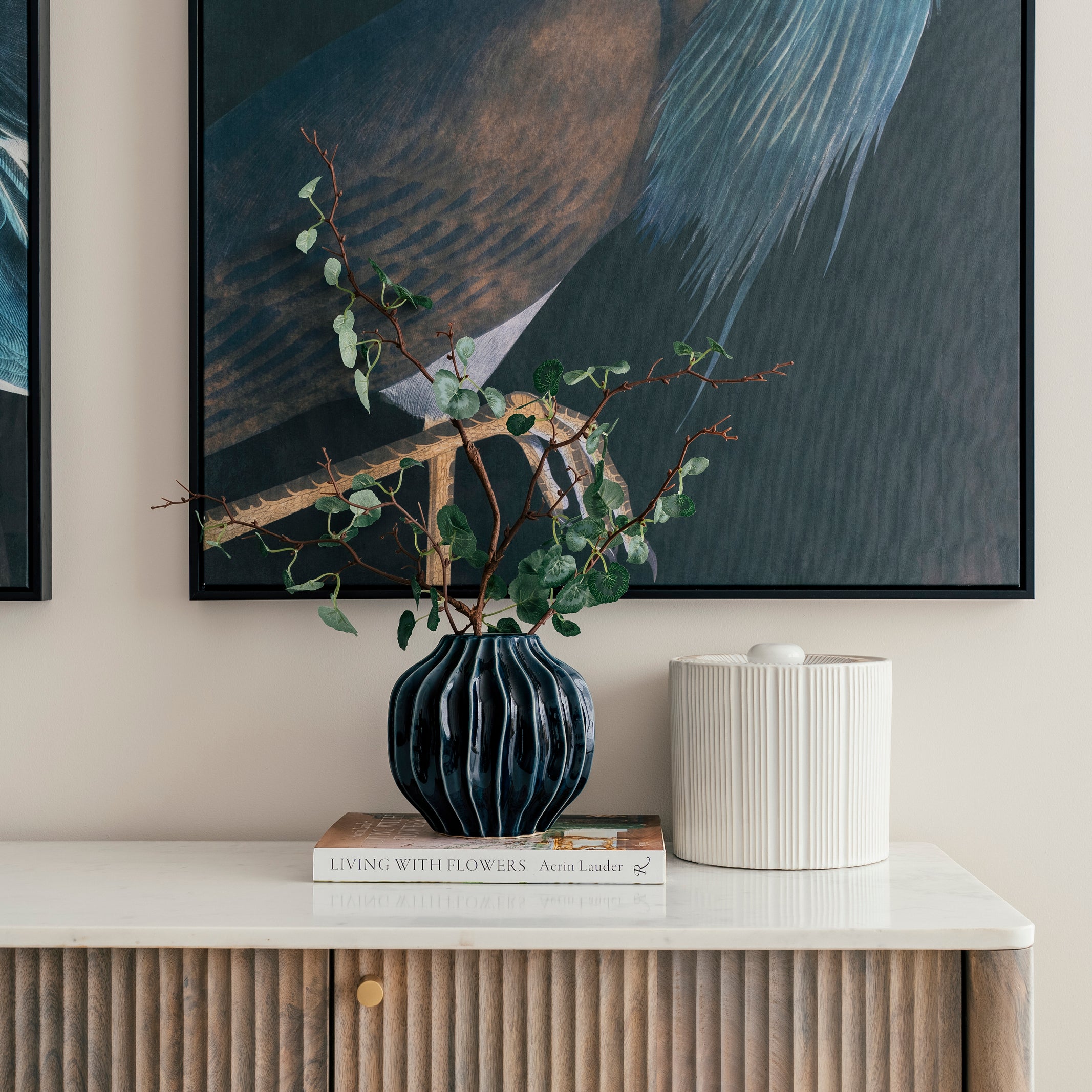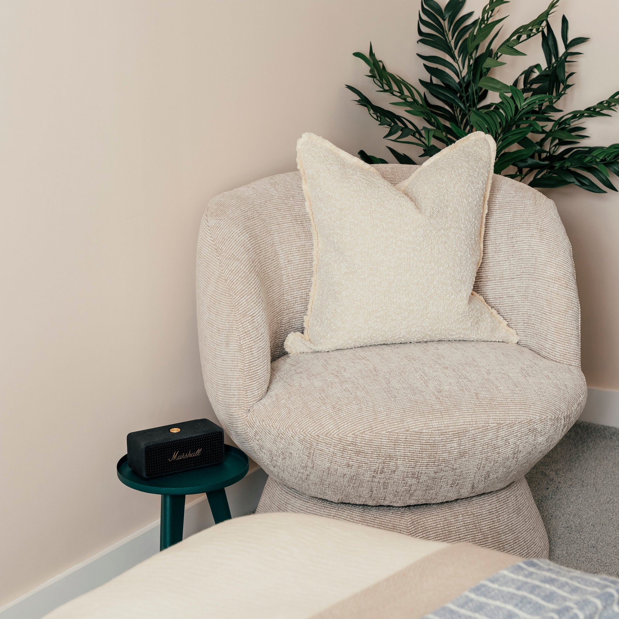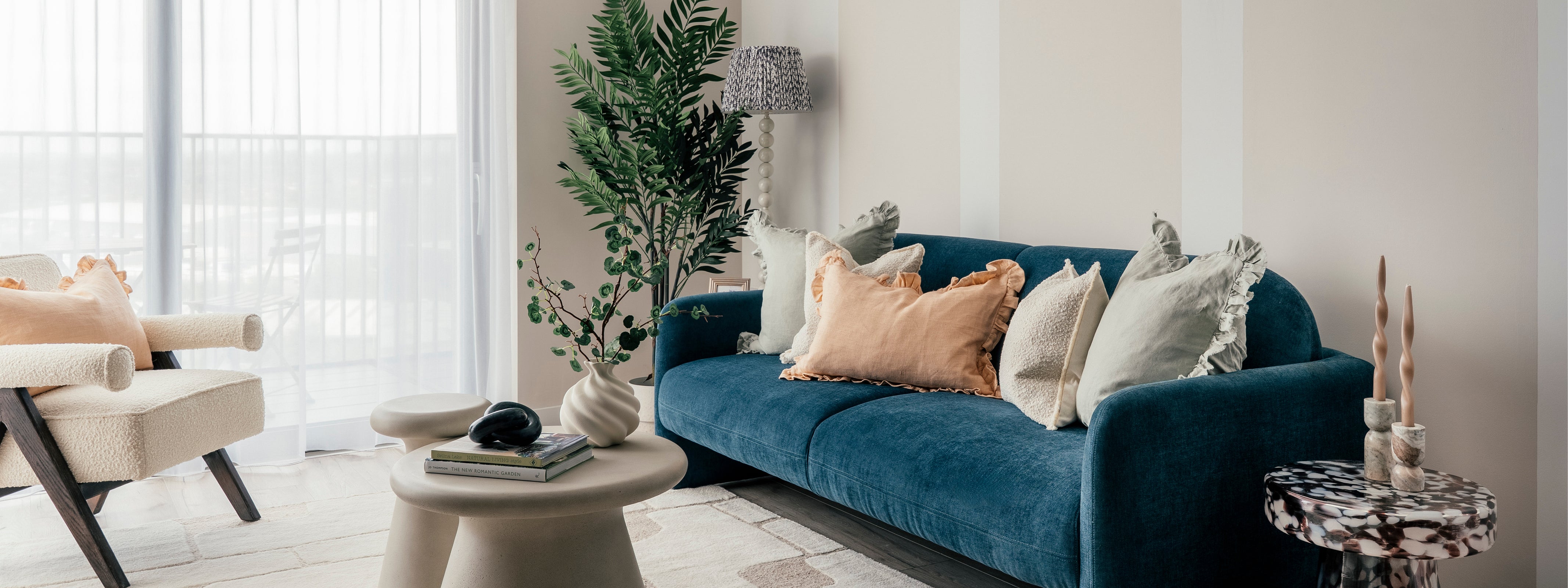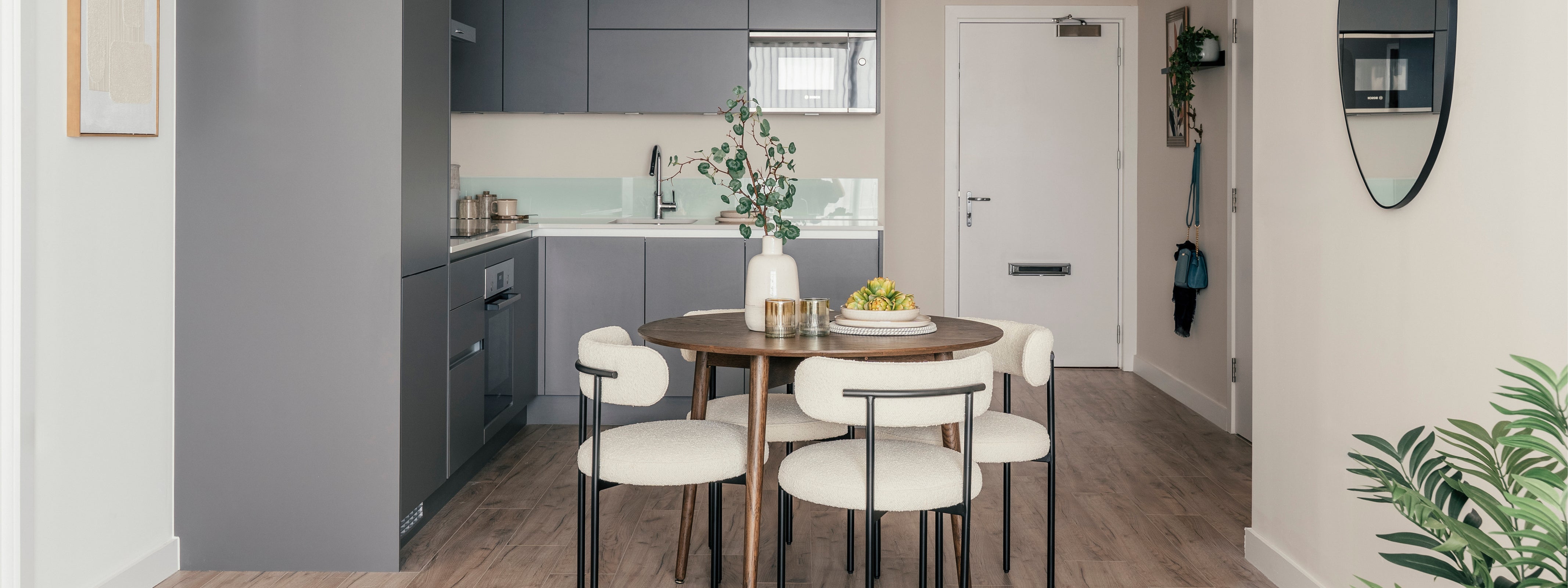 Using a variety of botanical touches through the assortment of plants and aquamarine colour pallet, we wanted to bring the essence of the outdoors into the space, reflecting the location of The Lock showhome being alongside Greenford Quay. The design features curved silhouettes in the furniture choices with round edges on table tops, and more subtly in the wallpaper and artwork. These details soften the square rooms, creating an open and relaxed atmosphere - perfect to embody the syle of living at Greenford Quay development.